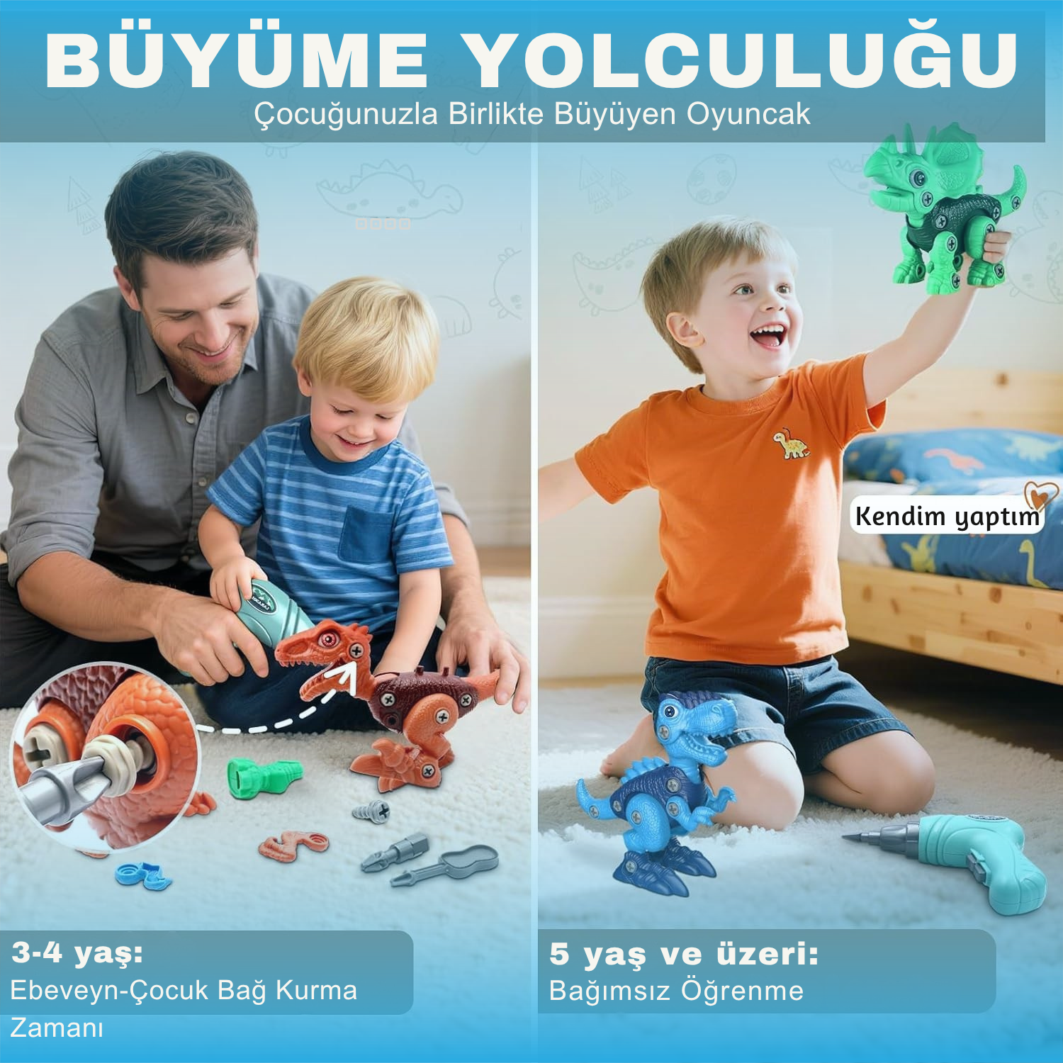 3-4 yaş arası: Ellerin onlarınkine yol gösterir. "Yardım et baba" evin içinde yankılanıyor. Her vida ortak bir zaferdir, her dinozor bir bağlanma anıdır. İşte ekransız çocukluk burada başlıyor— birlikte.